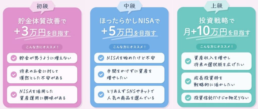 初級、中級、上級のレベル別になっていて、家計管理初心者から、投資も始めていてある程度知識のある方まで、幅広く活用できます。